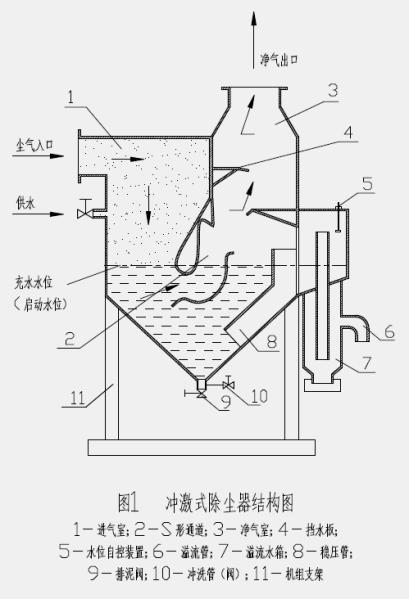 如图1所示,含尘气体由入口进入除尘器,气流转弯向向冲击水面,部分较大的尘粒落入水中。当含尘气体以16-28米/秒的速度通过上、下叶片间的“S”形通道时,激起大量的水花,使水气充分接触,绝大部分微细的尘粒混入水中,使含尘气体得以充分净化,经由“S”形通道后,由于离心力的作用,获得尘粒的水又返回漏斗。净化后的气体由分雾室挡水板除掉水滴后经气水分离器后干净气体由通风机排出