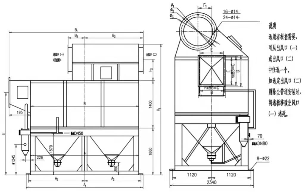 XCC/A-60 型除尘机组外形尺寸装配图(参见安装尺寸表)