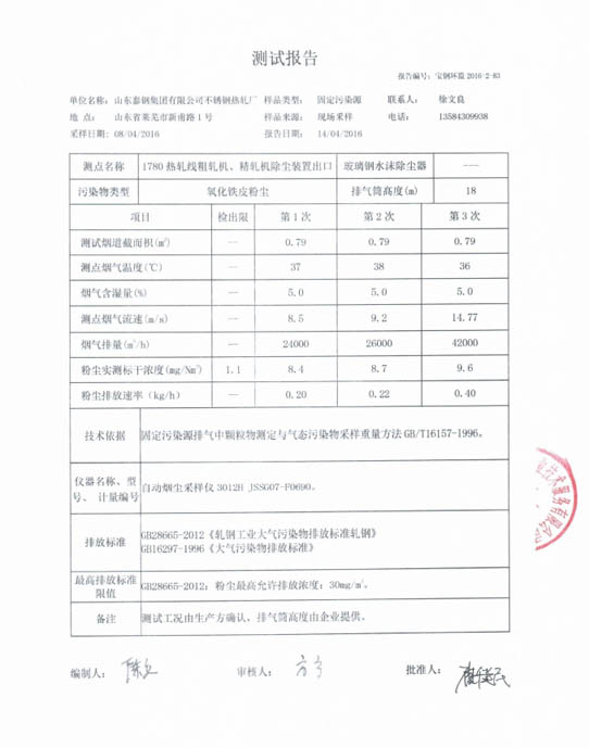 经检测净化处理后的气体颗粒物浓度低于8毫克/立方米,优于国家颁布的《轧钢工业大气污染物排放标准》(GB28665-2012)中的排放标准限值30毫克/立方米。1450毫米生产线新增除尘系统运行后,厂房内粉尘烟气大幅减少,为一线职工创造了良好的工作环境。