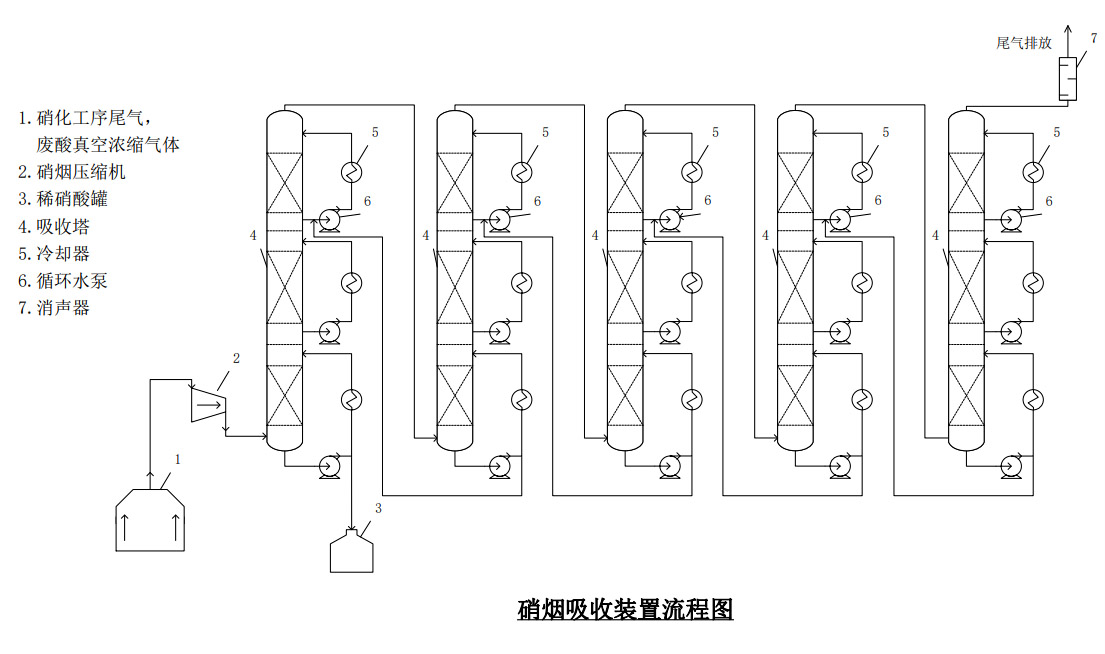 1、压缩机水压溶解部分硝烟生成稀硝酸后,再用多级吸收塔是在低压、常温条件下吸收剩余硝烟尾气,比传统回收硝烟流速低,塔内停留时间长,吸收率高。