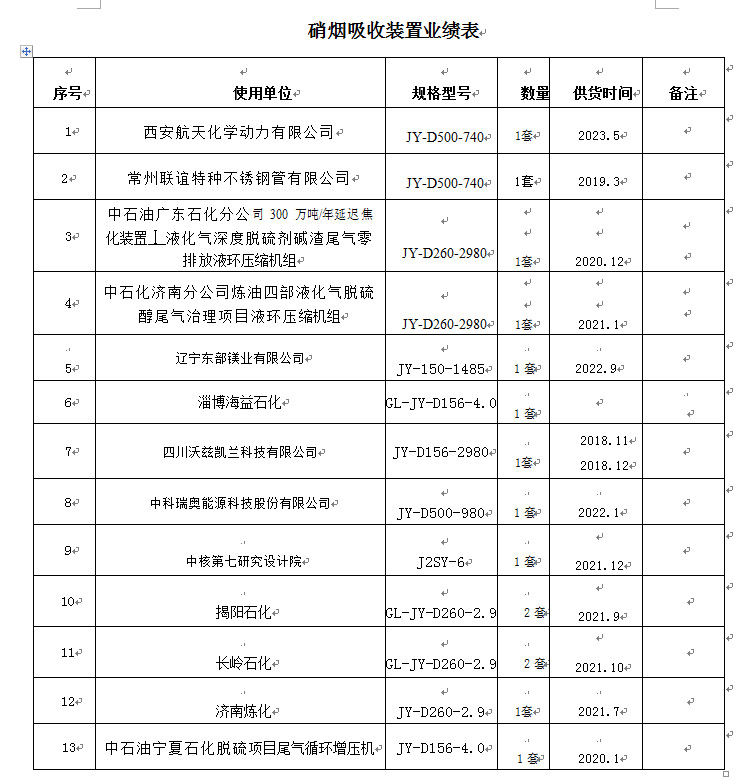 4、经兵器工业、中石化、中化集团多家单位使用后,不需添加任何药剂、氧化剂,吸附剂,吸收硝烟后的尾气达到国家和地方排放标准,可直接高空排放,不产生新的三废。